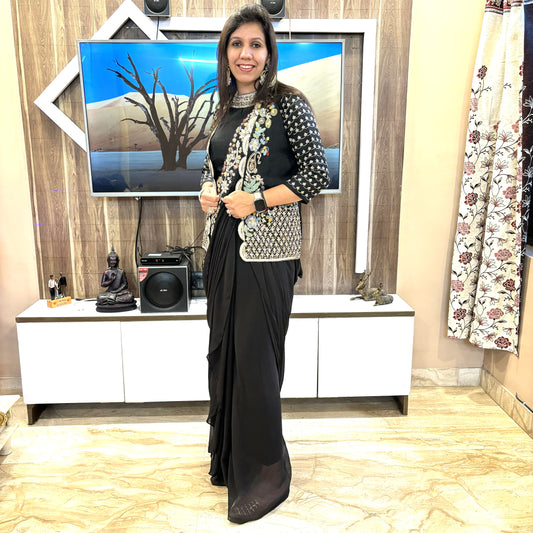 Noir Luxe: Black Pre-Draped Saree & Embellished Jacket SetRegular price Rs. 9,995.00Regular priceUnit price / perRs. 15,995.00Sale price Rs. 9,995.0037% OFFSale